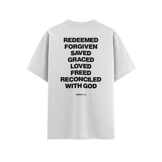 Redimido. Perdoado. Salvo. Alvo da graça. Amado. Livre. E reconciliado com Deus. Essa camisa carrega, em cada palavra, a história de quem...