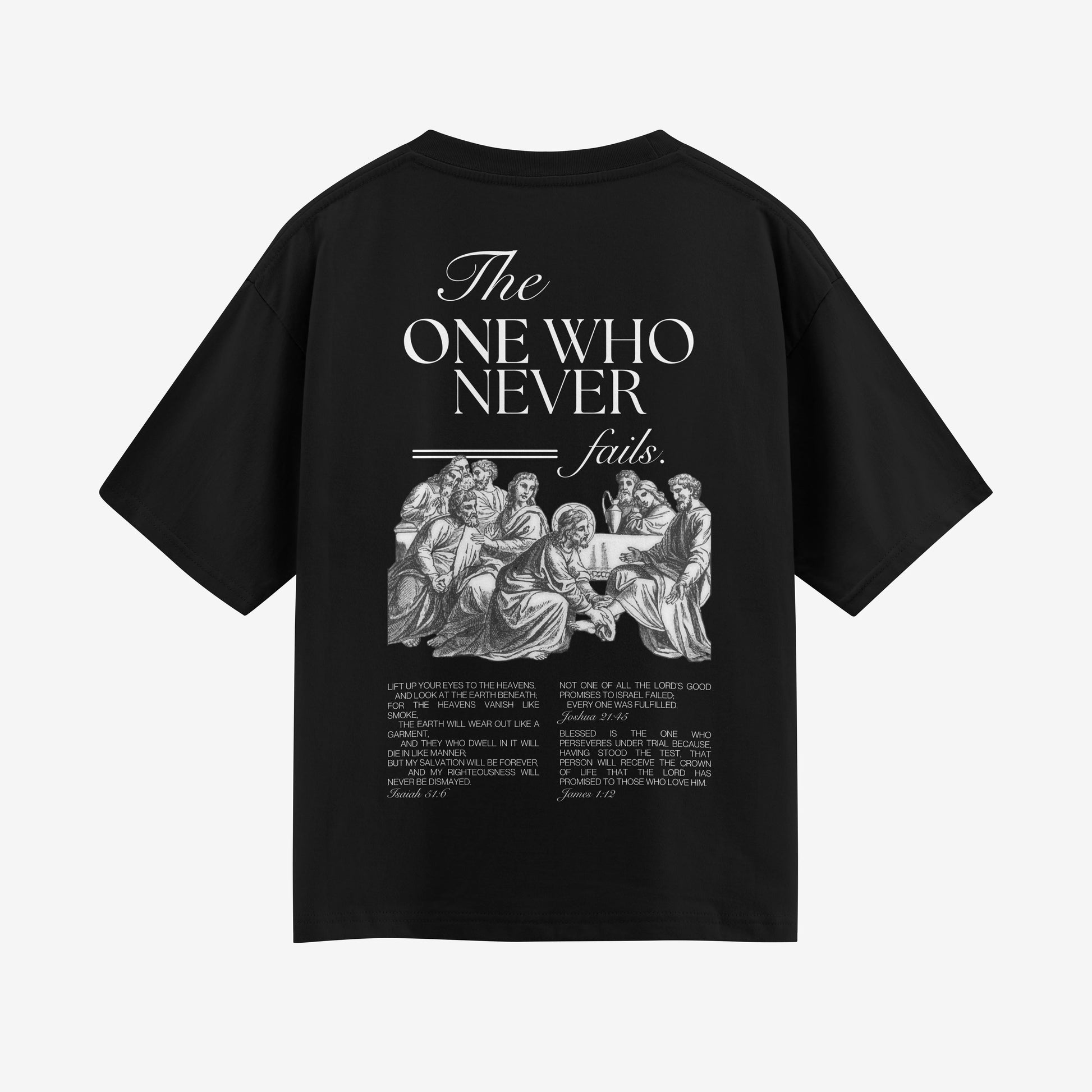 Essa camisa exalta Aquele que nunca falha, nunca muda, nunca quebra Suas promessas. Isaías, Josué e Tiago declaram a mesma verdade: Ele é fiel — ontem, hoje e sempre. Vista essa convicção. E lembre-se: você segue Aquele que nunca falha.